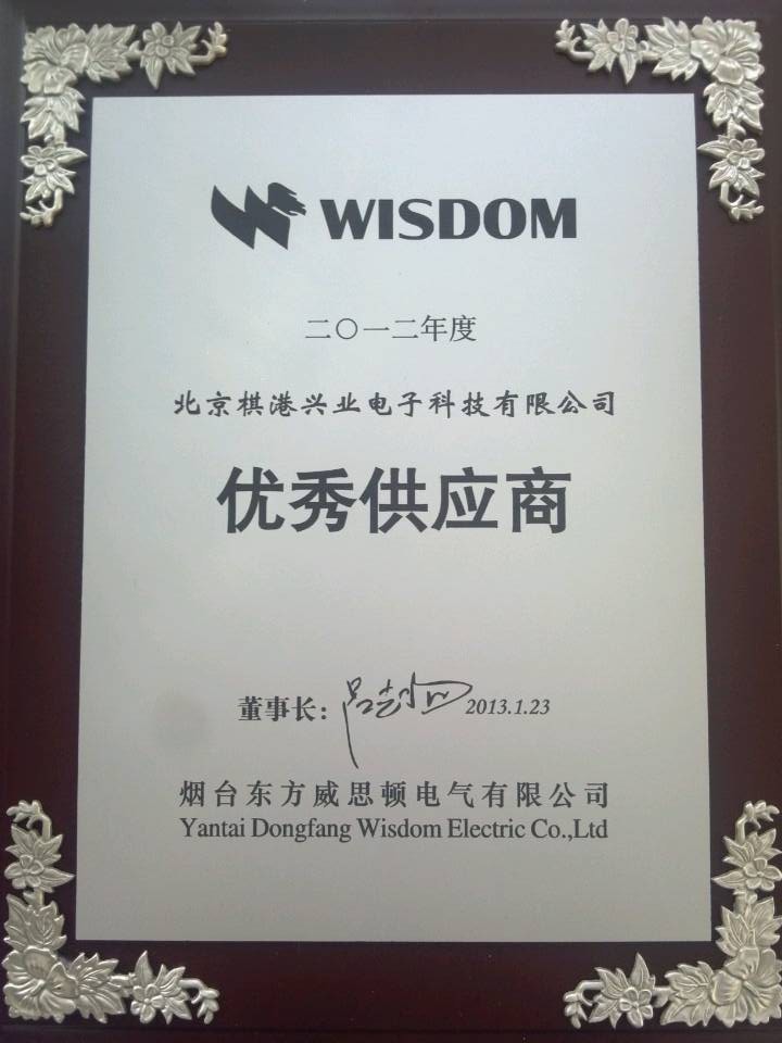 棋港青鳥办代表棋港电有限公司于 2013年1月 23日参加了威思顿的十周年庆典, 同時,我司被评为东方威思顿的"优秀供应商". 附件是奖牌.